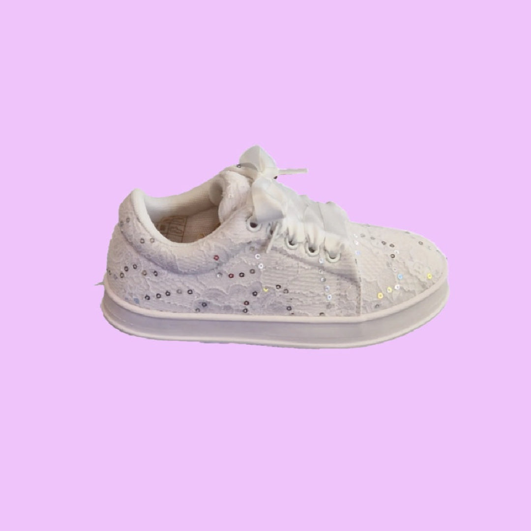 Communion trainers that add a touch of elegance to any outfit with their beautiful white lace and little silver sequence, and cute satin laces. They offer both style and comfort for a smart casual look.