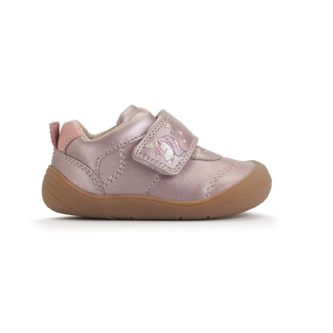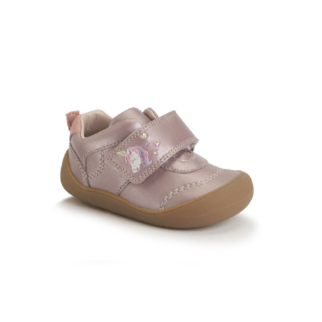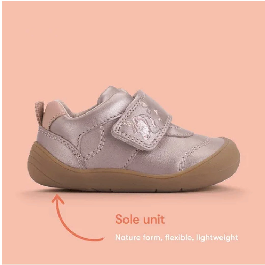 Start-rite Moonbeam is a closed girls' shoe crafted from a beautiful blush iridescent shimmer leather, featuring an adorable embroidered unicorn character on the strap for a playful touch. The large rip-tape fastening ensures quick and easy dressing, allowing for a secure fit with minimal fuss. Designed with little explorers in mind, the toe and heel bumpers provide added protection, helping the shoes withstand bumps and tumbles as they take their first steps. Combining comfort, style, and durability, this shoe is perfect for your little one as they navigate their world with confidence - and a unicorn by their side!