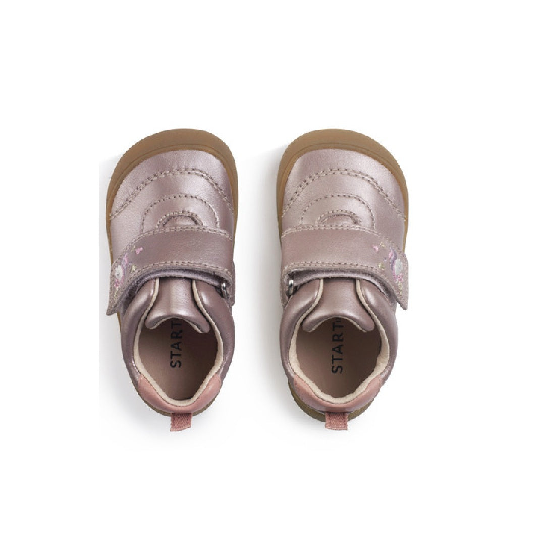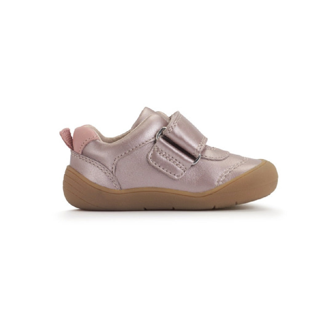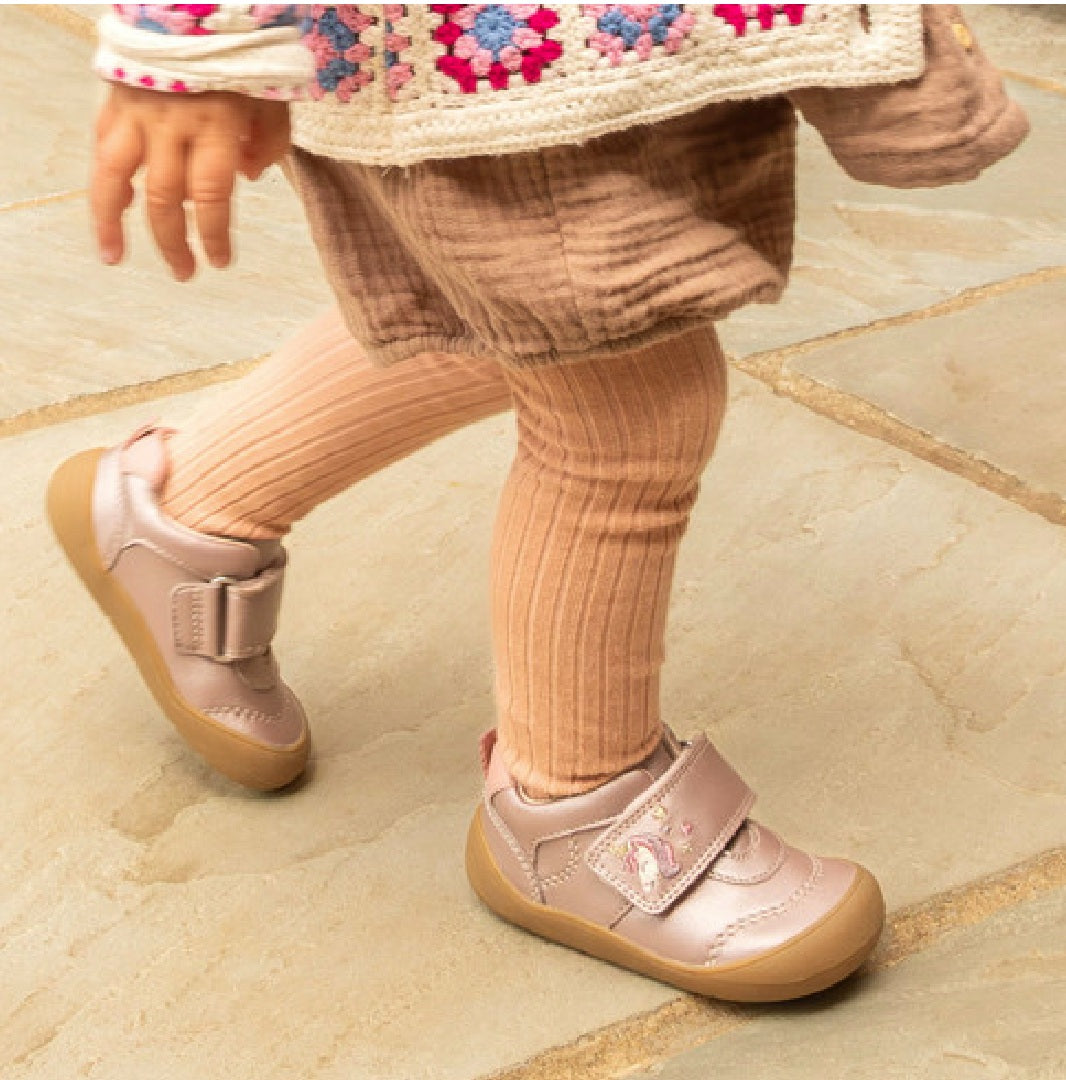 Start-rite Moonbeam is a closed girls' shoe crafted from a beautiful blush iridescent shimmer leather, featuring an adorable embroidered unicorn character on the strap for a playful touch. The large rip-tape fastening ensures quick and easy dressing, allowing for a secure fit with minimal fuss. Designed with little explorers in mind, the toe and heel bumpers provide added protection, helping the shoes withstand bumps and tumbles as they take their first steps. Combining comfort, style, and durability, this shoe is perfect for your little one as they navigate their world with confidence - and a unicorn by their side!