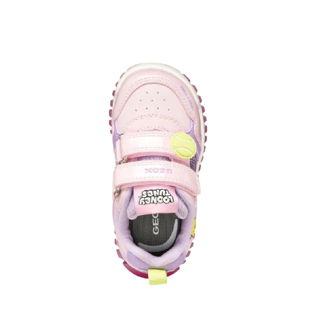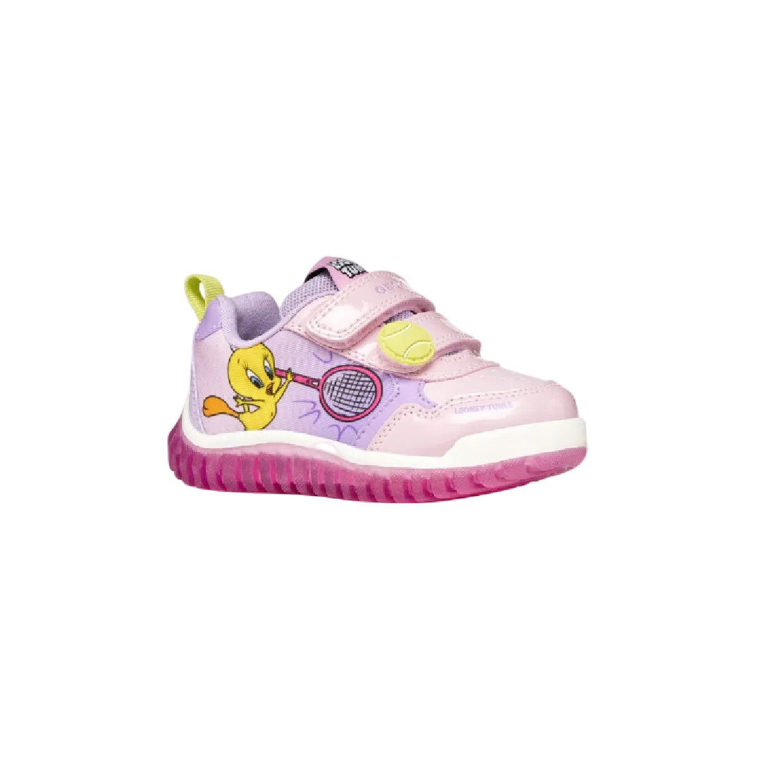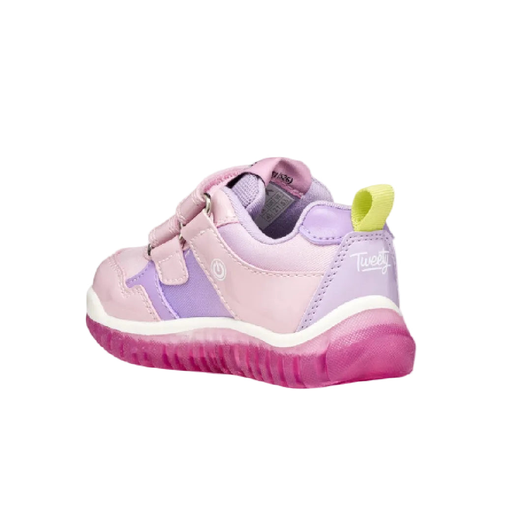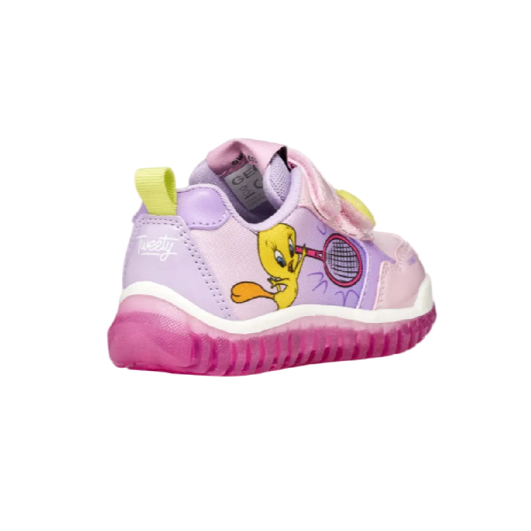 Trendy and sporty baby sneakers, created through a collaboration between Geox and Warner Bros. In this lilac version, Lightyloo features graphics dedicated to the Looney Tunes character Tweety and patches with a tennis ball on a strap. Made from patent-effect material and fabric, they feature lights integrated into the outsole to increase the fun with every step.