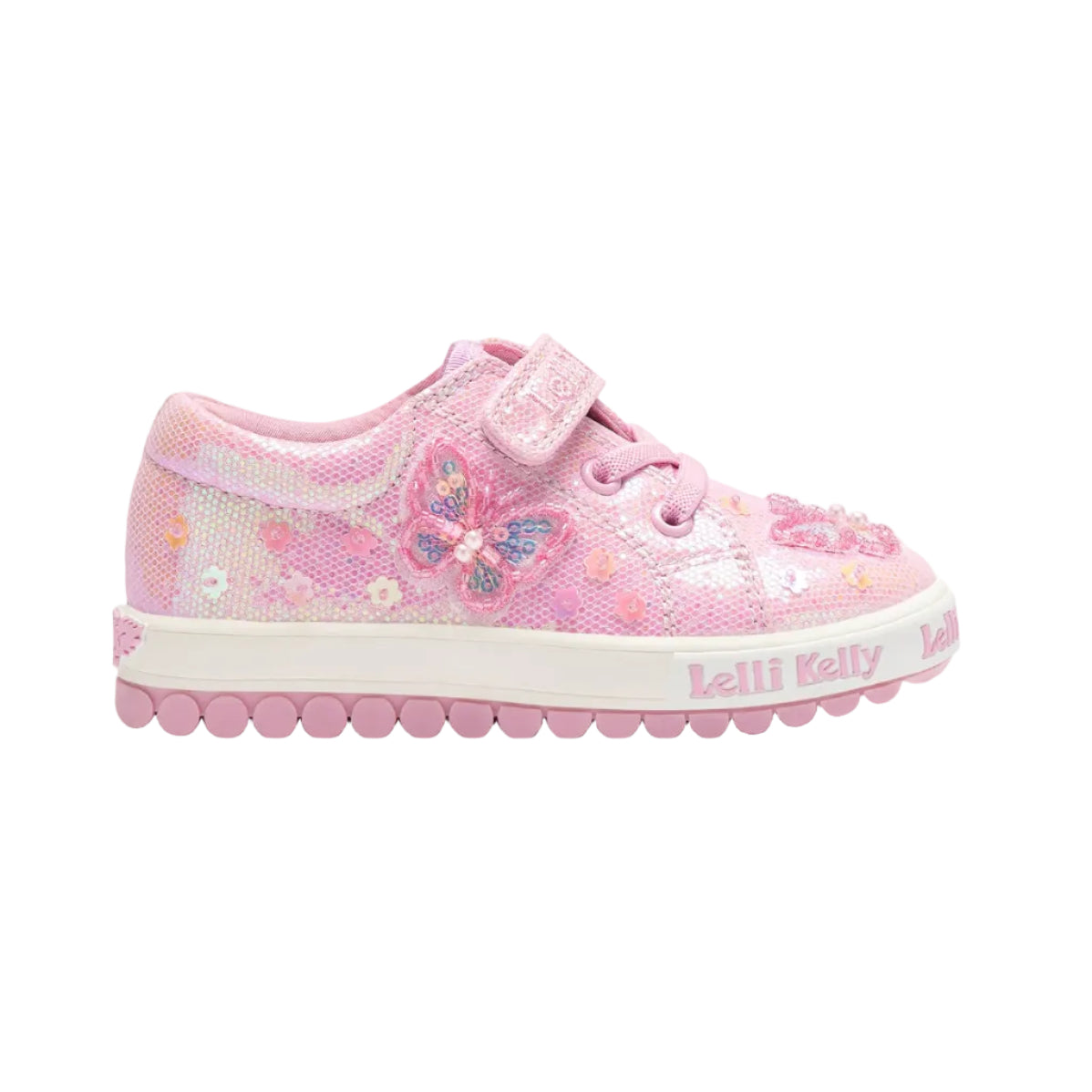 You will feel truly enchanted wearing these Lelli Kelly Emerald canvas shoes. Uppers are decorated with beaded and sequined flowers and a butterfly. Textile lining and removable moisture wicking insole helps keep those feet fresh.  Lelli Kelly branding is embroidered onto the adjustable hook and loop fastening and around the sole unit