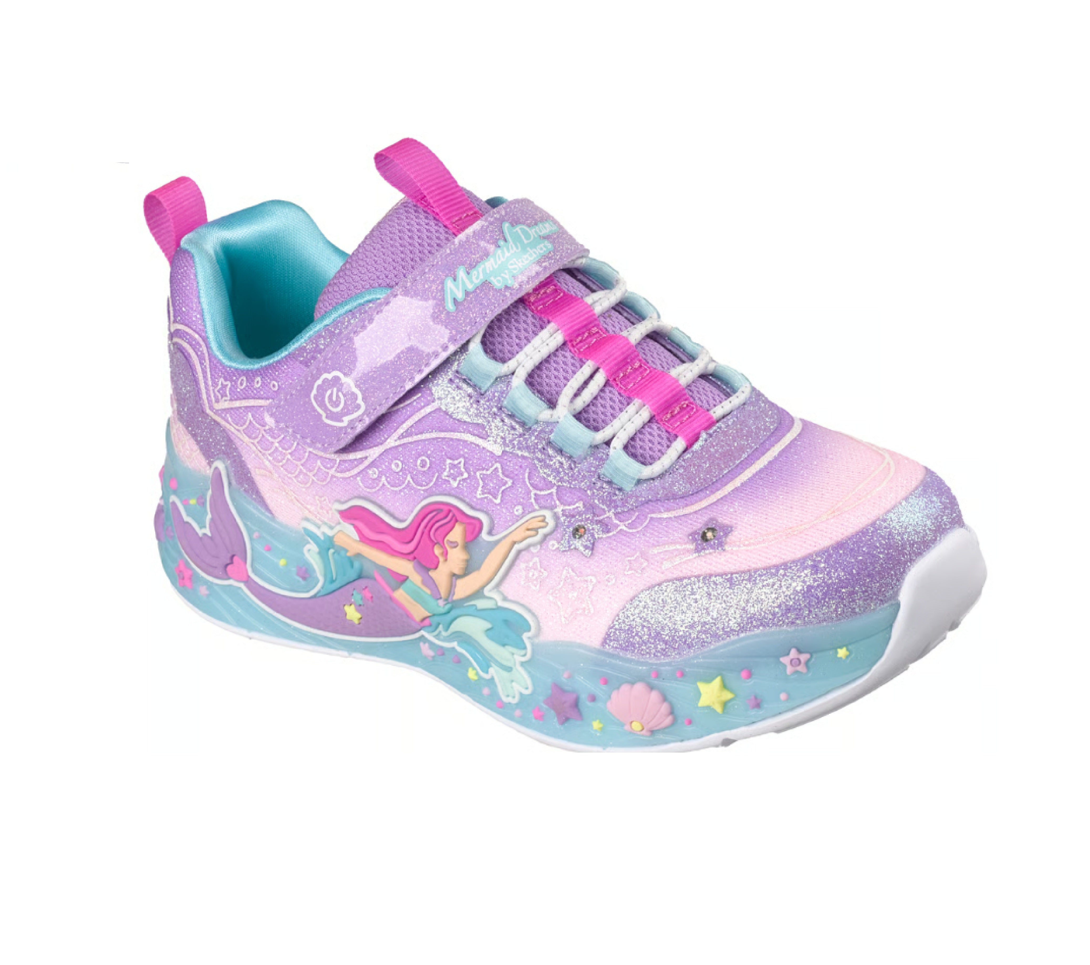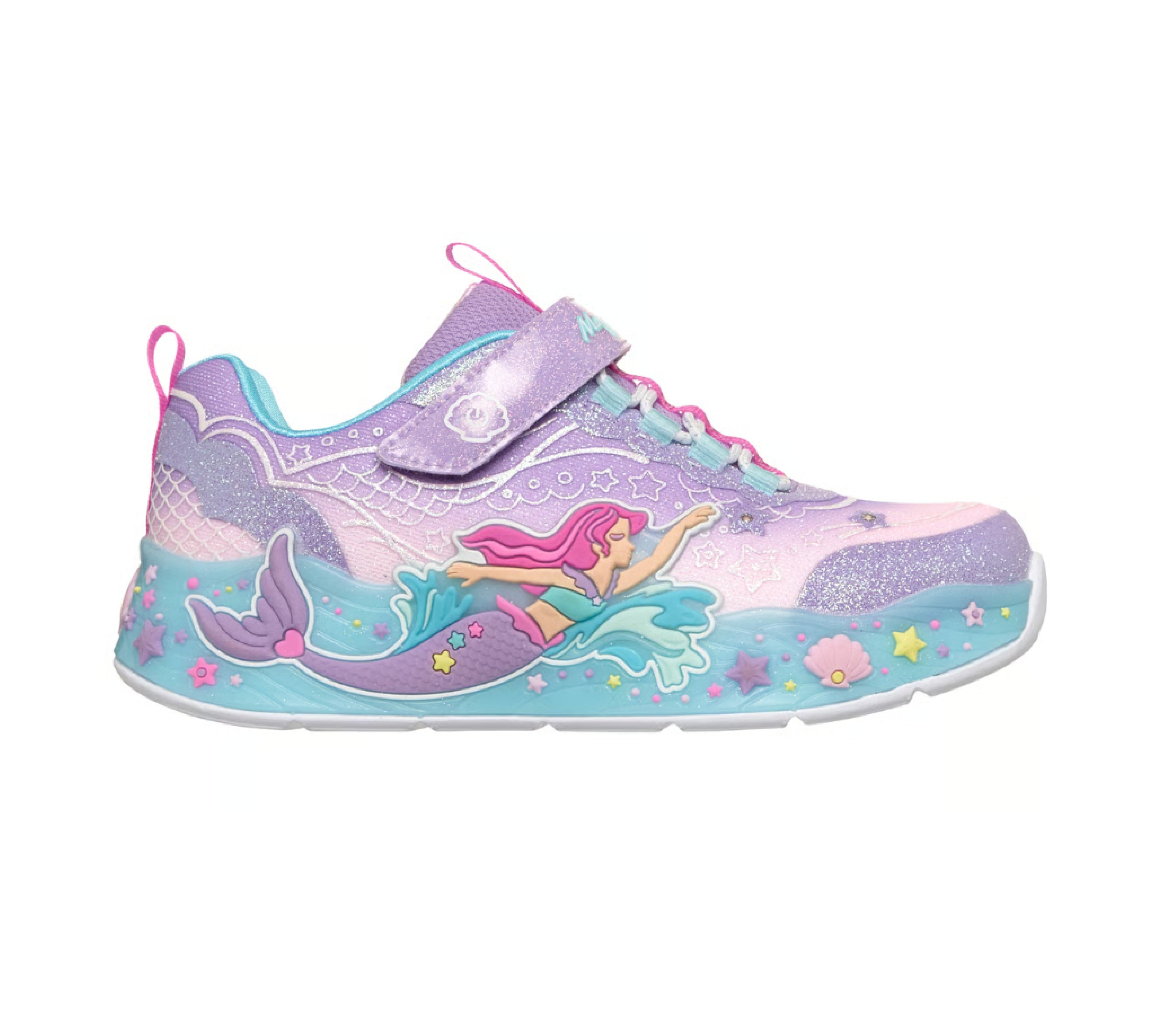 Sparkle and shine in style wearing the Mermaid Dreams Light Up  sneakers. This sporty Magical Collection® features a lighted mermaid wrap sneaker, bungee and strap closure. The low-top shoes have Mesh and synthetic glitter finish upper, cotton lining, and cushioned comfort insole.