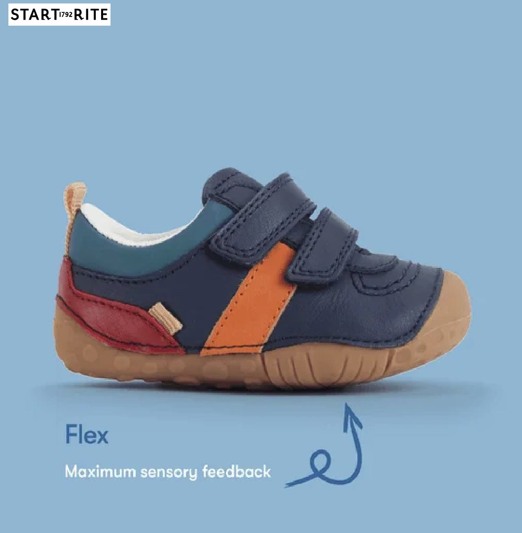 Start-rite Zap pre-walker is the perfect blend of style, comfort and practicality for little feet. Crafted from soft navy leather, it features vibrant red and orange accents that make this shoe both eye-catching and versatile. The supple leather gently moulds to the natural shape of the foot, offering a snug and supportive fit that promotes healthy foot development. With padded ankles and cushioned insoles, Zap ensures superior comfort and gentle protection for delicate pre-walking feet. The double rip-tape straps and a choice of three width fittings allow for a secure, precision fit, ensuring that little feet stay safe and comfortable as they start to explore. The flexible sole is designed to move naturally and provide maximum sensory feedback, helping to support with ease and confidence. Whether it's a day of indoor play or outdoor discovery, Zap pre-walker is the ideal choice to help guide your child toward their next milestone in comfort and style.